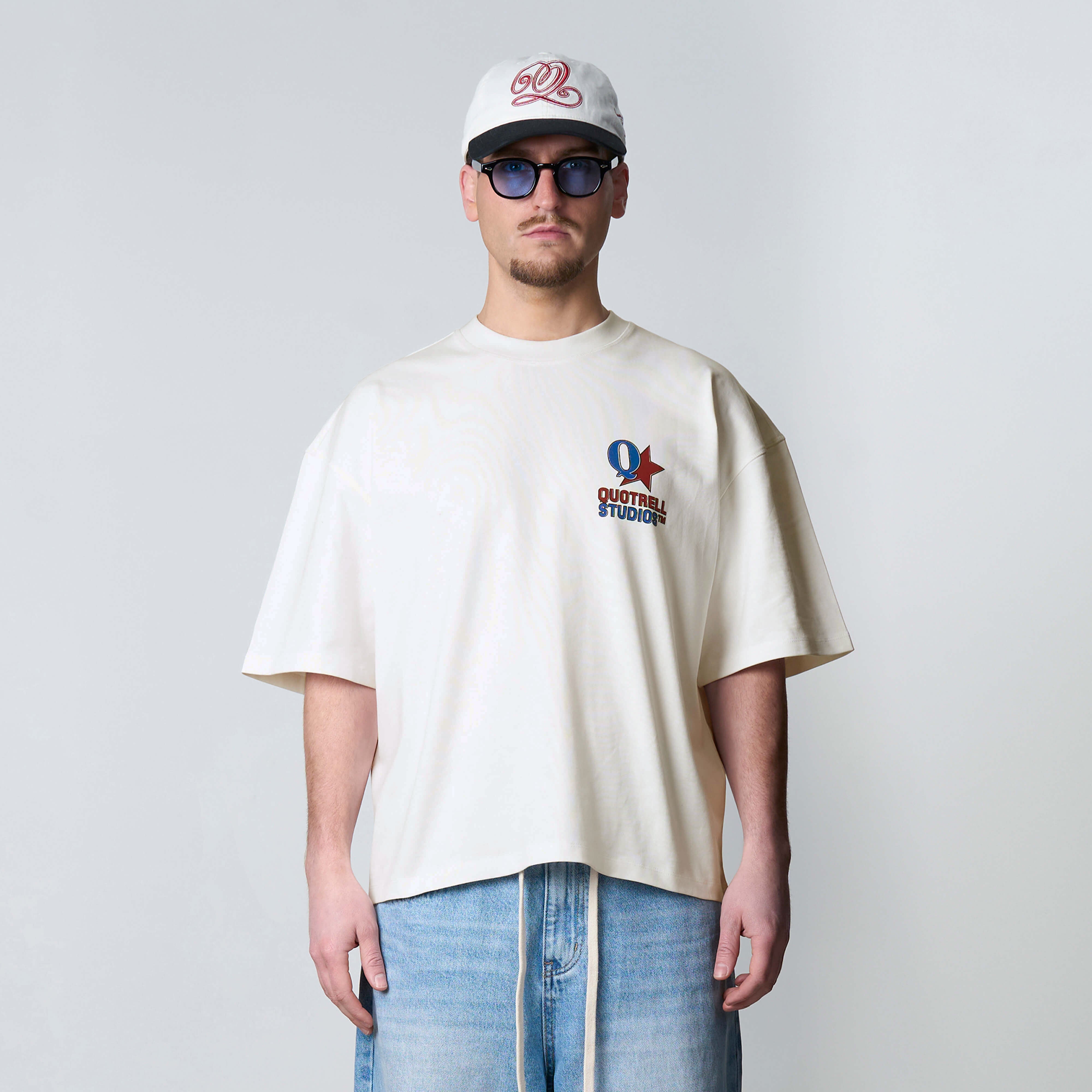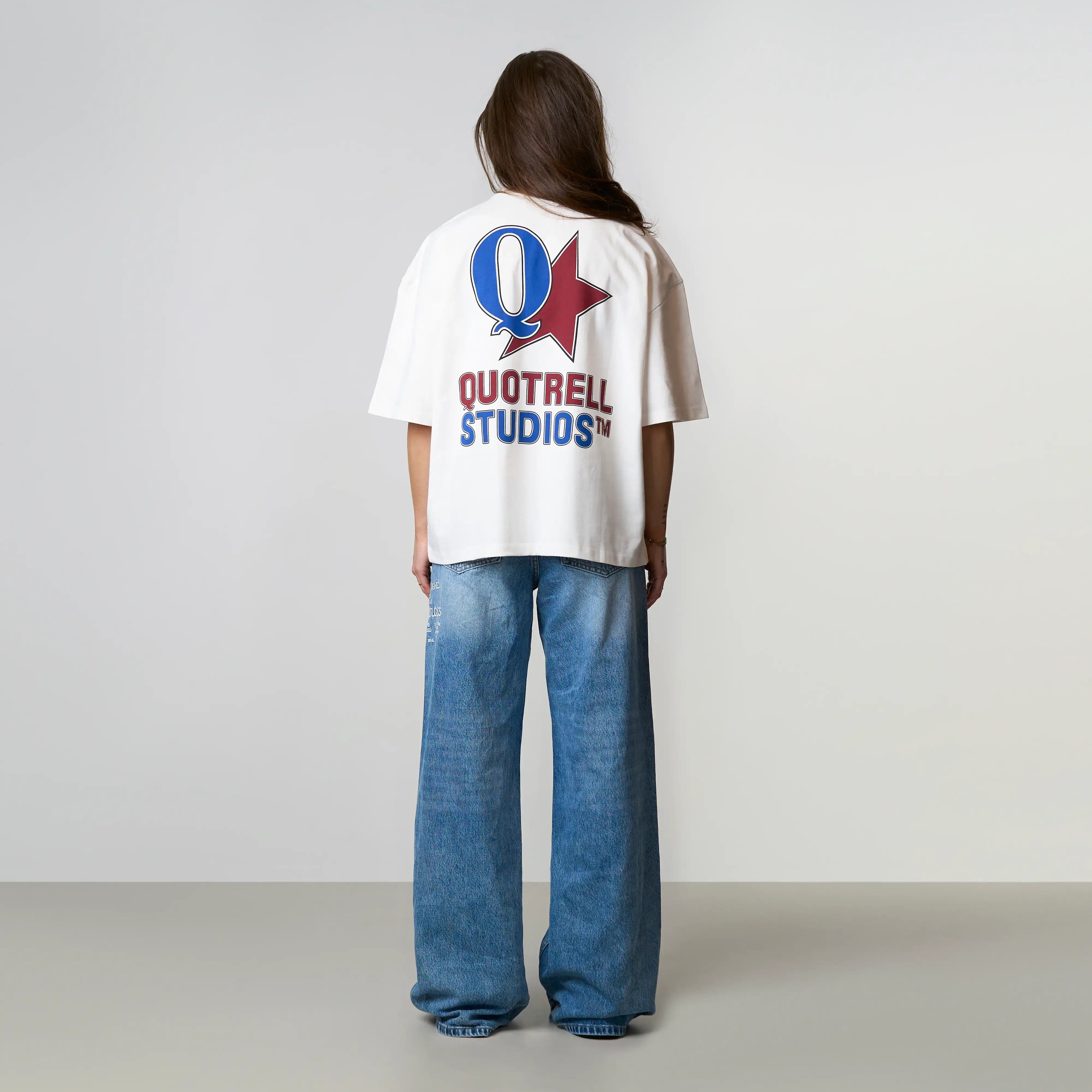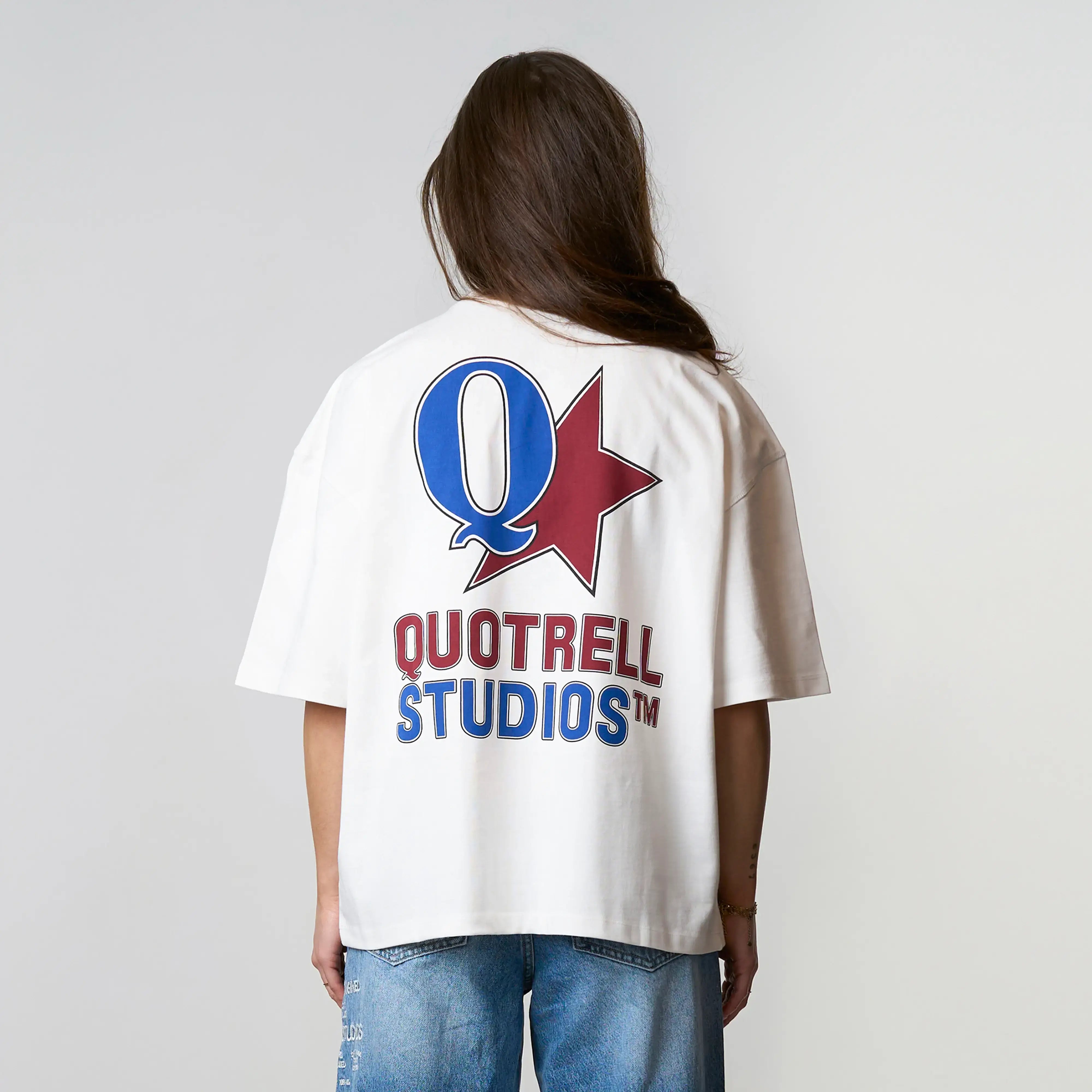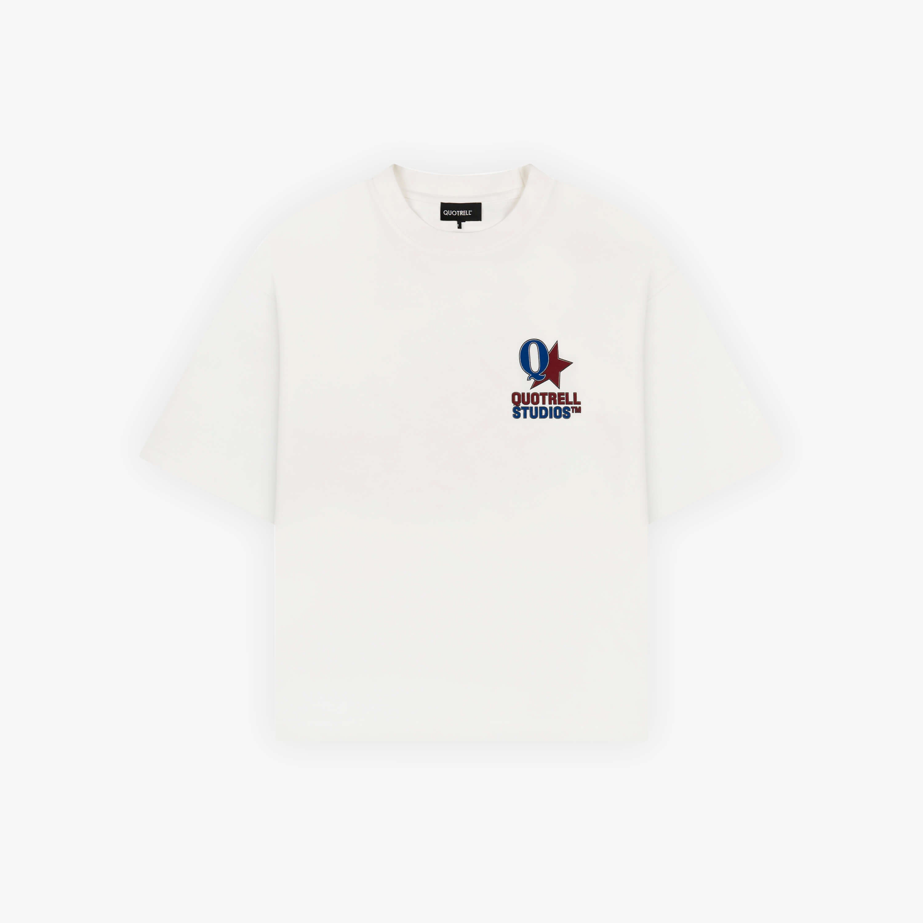 The Carmine Tee features a cropped oversized fit with a soft cotton fabric for everyday comfort. Designed with a clean front and subtle Quotrell Studios branding for a minimal look. The back stands out with a bold graphic logo print, adding a strong and recognizable statement. A versatile tee that combines comfort with a modern streetwear aesthetic.