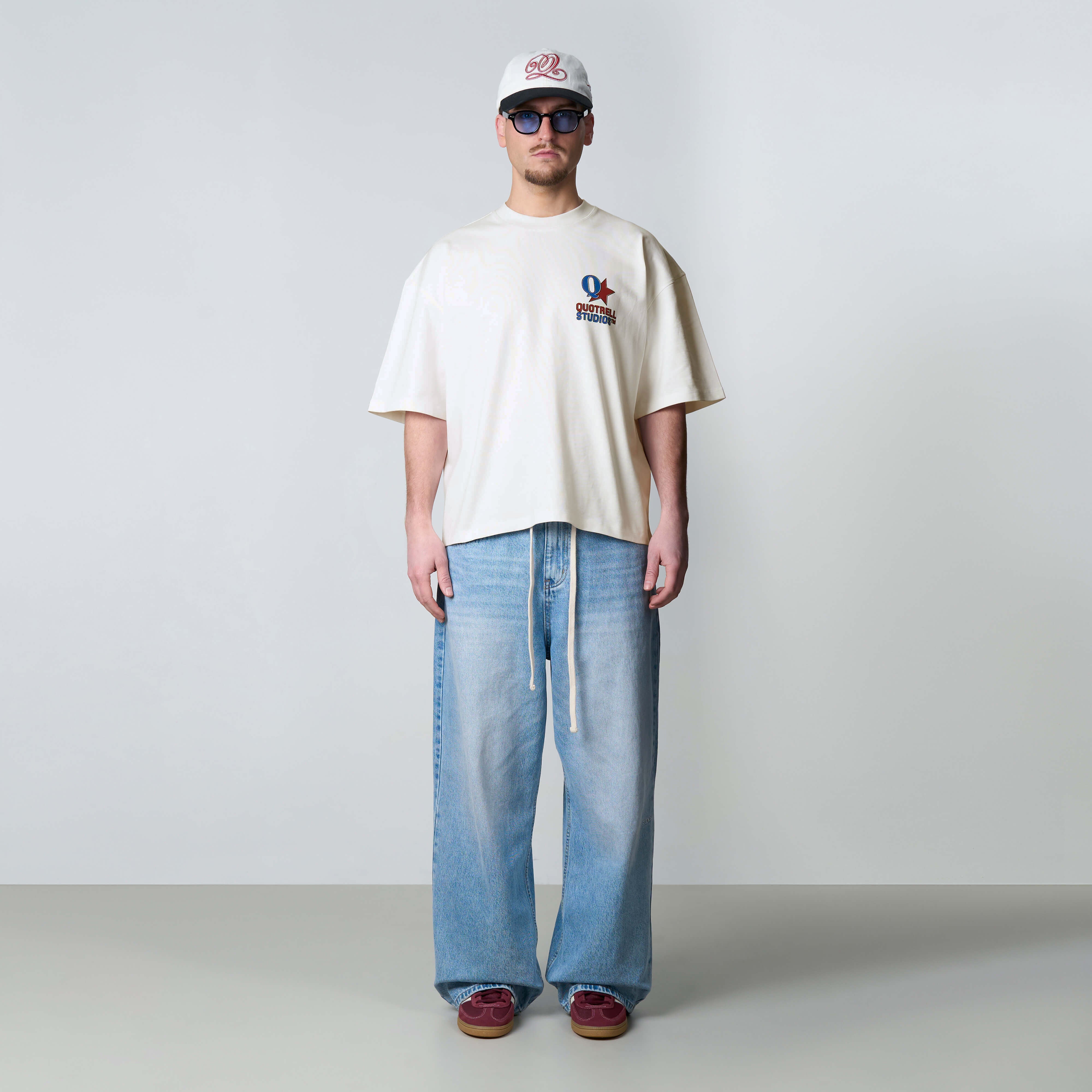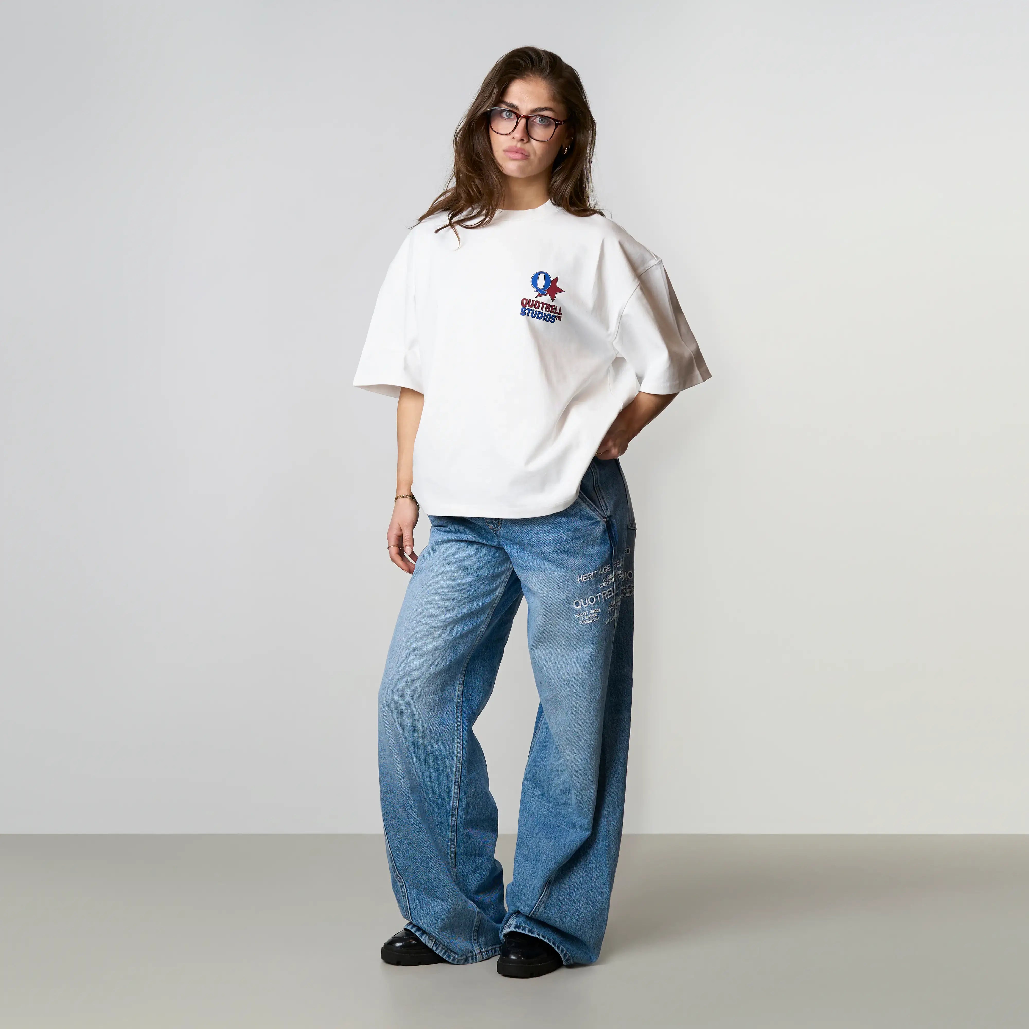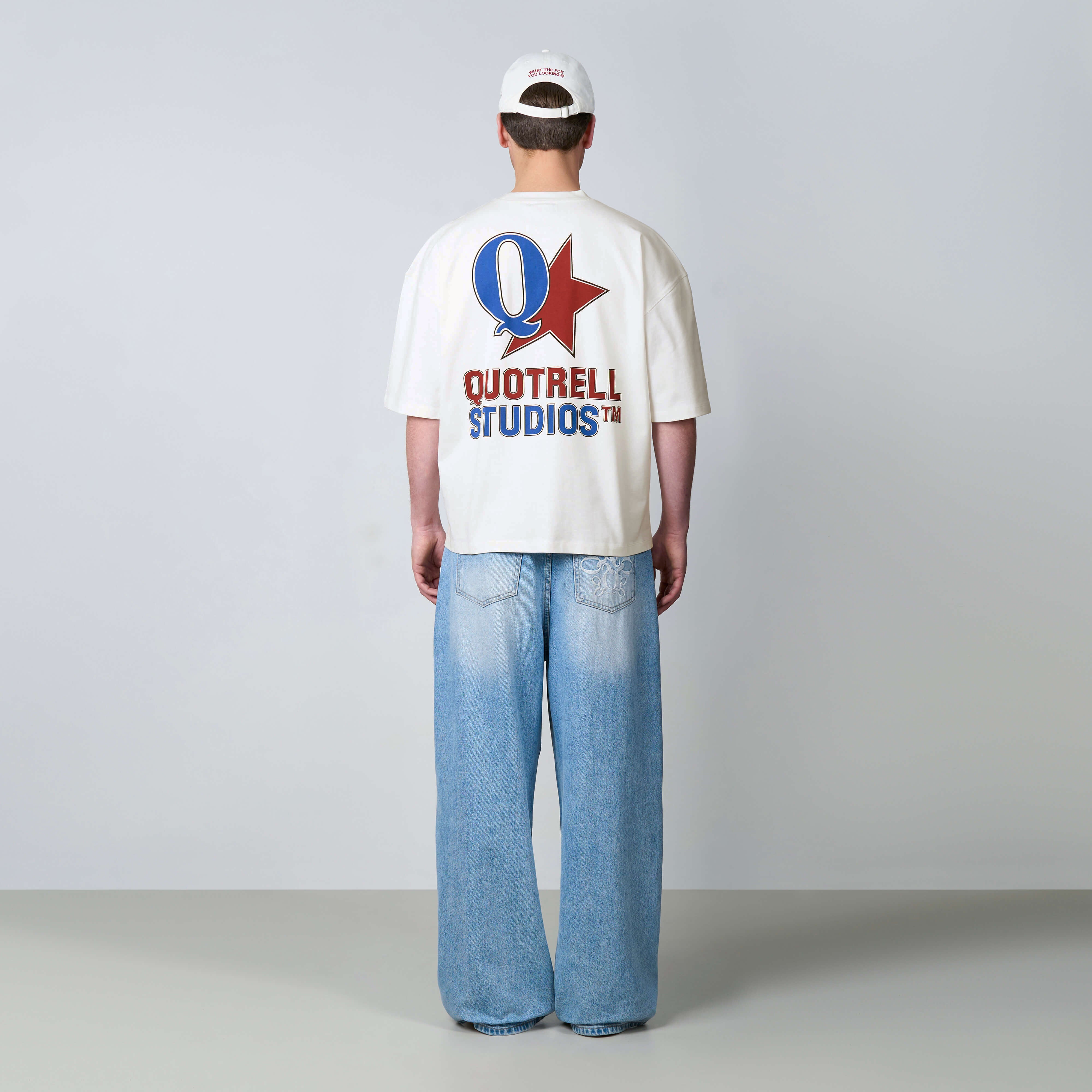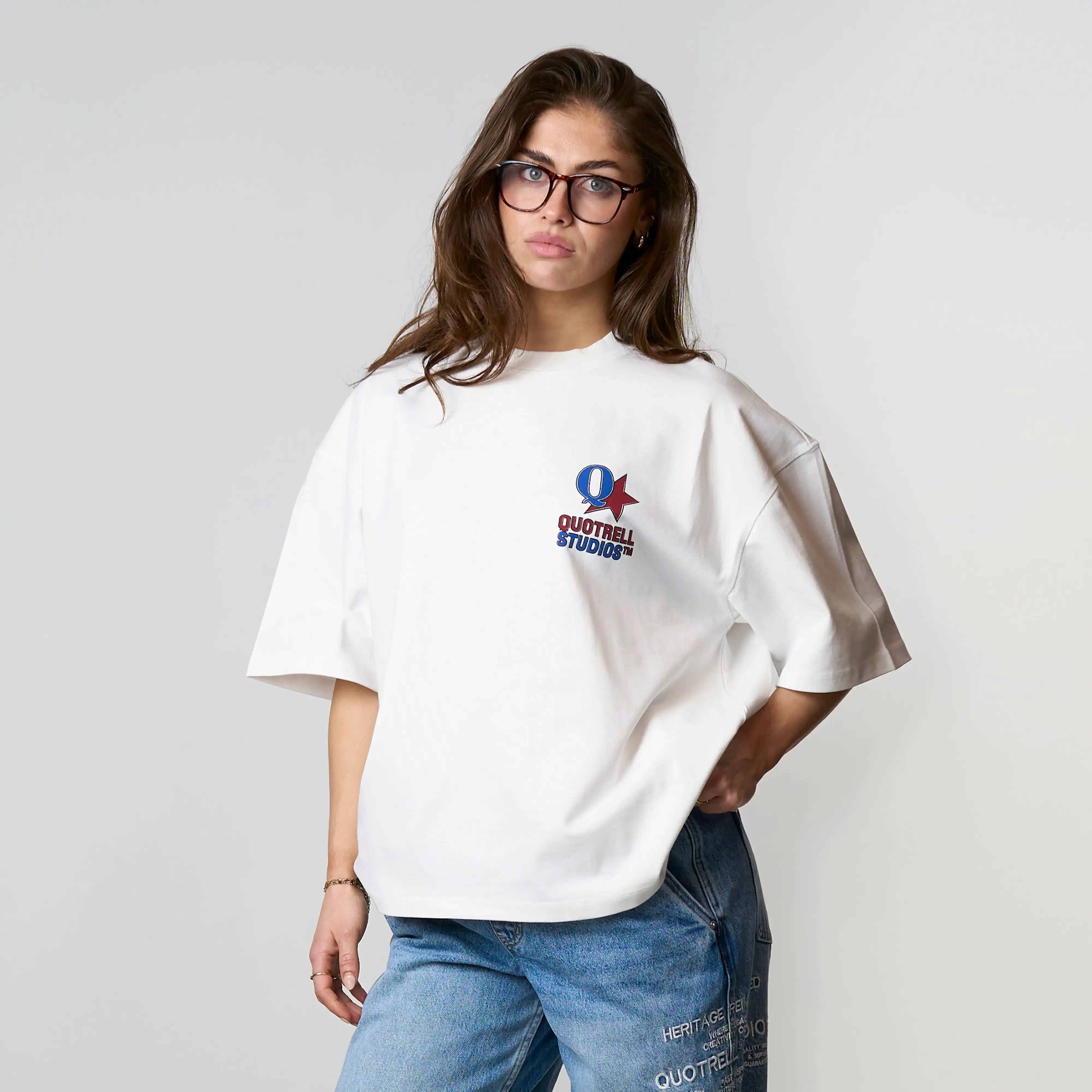 The Carmine Tee features a cropped oversized fit with a soft cotton fabric for everyday comfort. Designed with a clean front and subtle Quotrell Studios branding for a minimal look. The back stands out with a bold graphic logo print, adding a strong and recognizable statement. A versatile tee that combines comfort with a modern streetwear aesthetic.