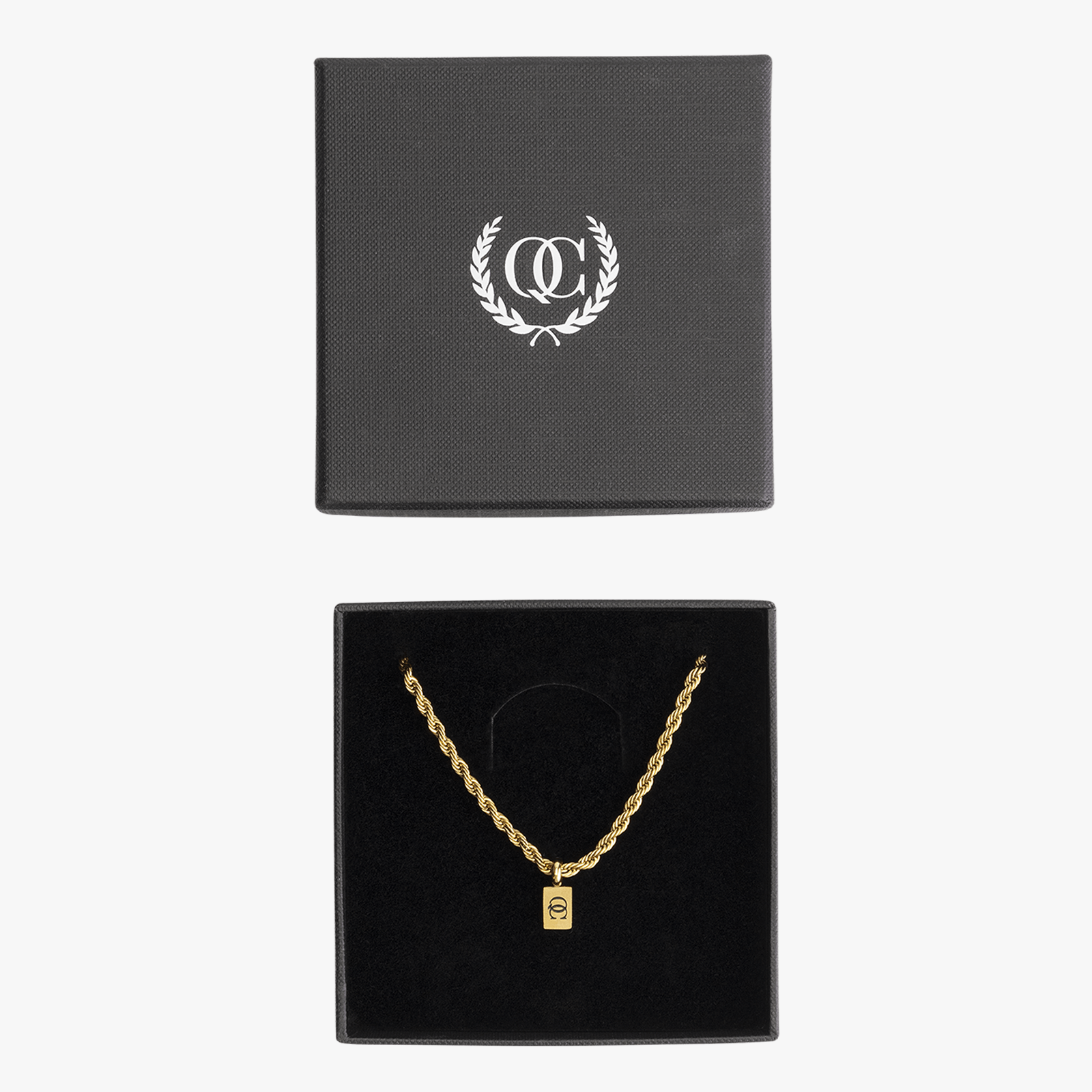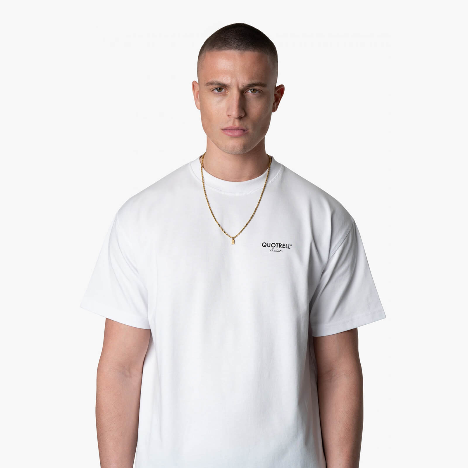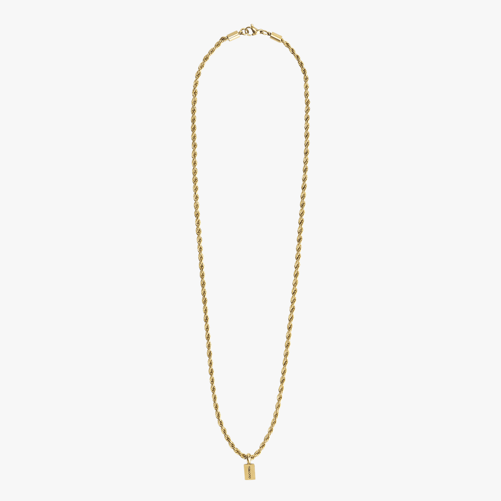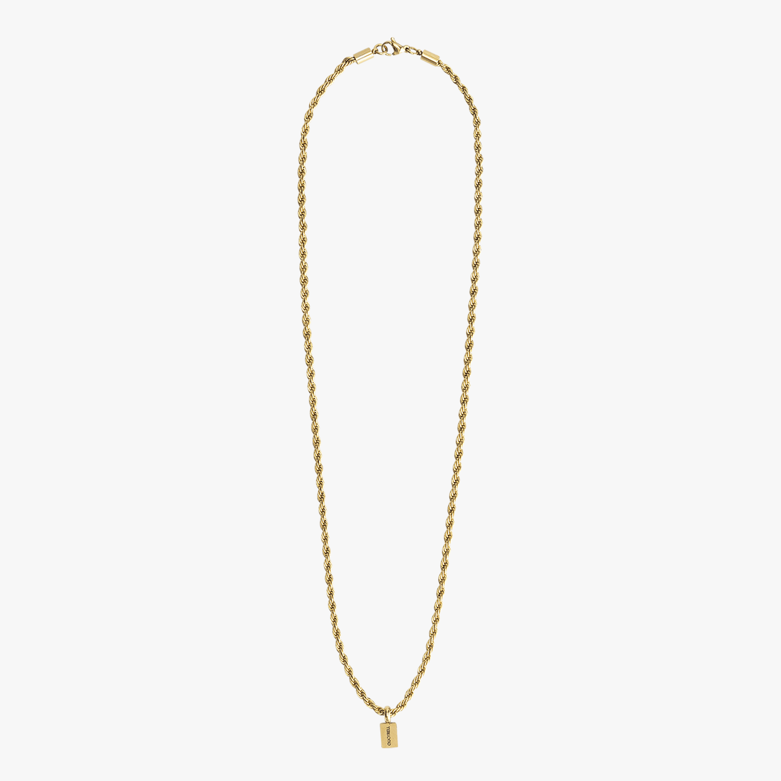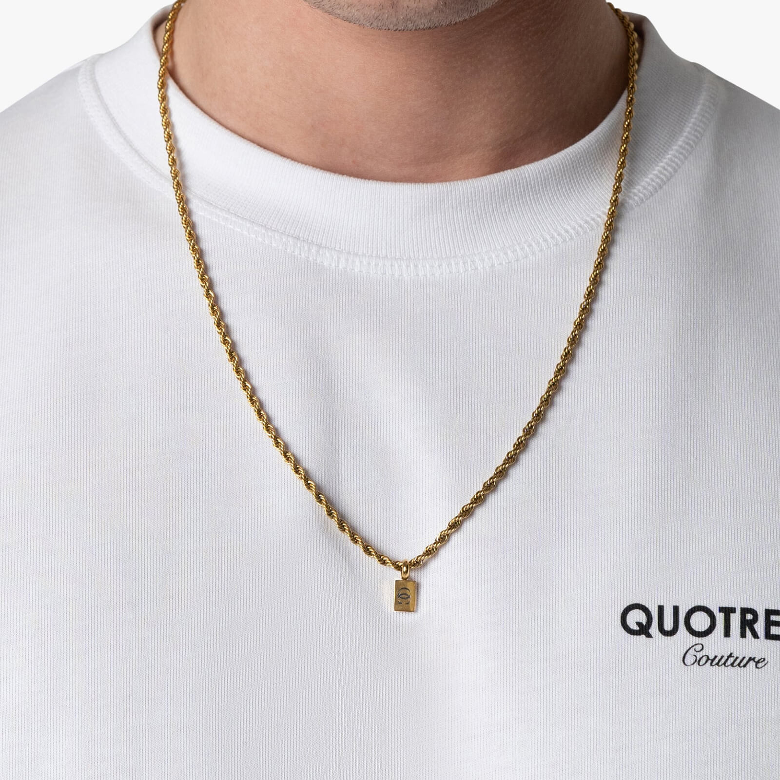 Notre chaîne torsadée est le complément parfait pour toute tenue. Disponible en acier inoxydable doré et argenté, ce collier pour homme se termine par un maillon en corde tressée. Le pendentif discret arbore notre logo Quotrell Couture d’un côté et affiche subtilement notre nom de marque de l’autre. La chaîne torsadée est proposée en deux longueurs (50 cm et 60 cm) et se ferme au niveau du cou.